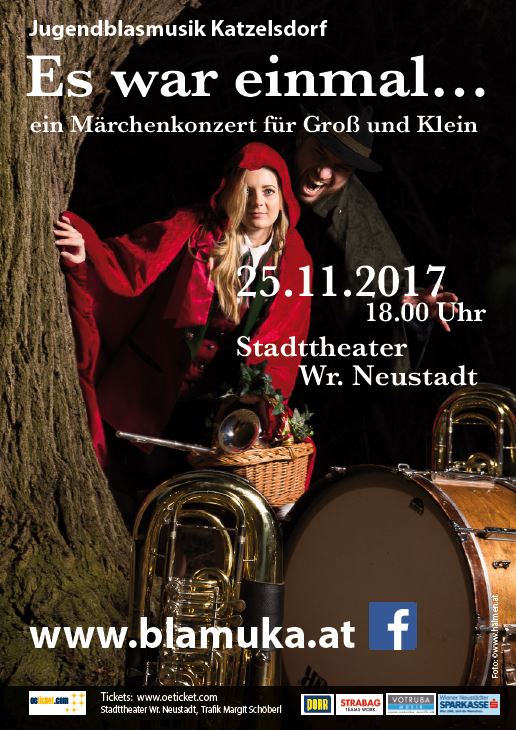 Die Jugendblasmusik Katzelsdorf veranstaltet alle 2 Jahre ein Herbstkonzert, das unter einem speziellen Motto steht. Heuer möchten wir uns dem Thema „Märchen“ widmen und ein ganz besonderes Werk zur Aufführung bringen: „Es war einmal…“ ist ein Singspiel eines belgischen Komponisten, das für Blasorchester, Sprecher, Schauspieler und großen Kinderchor geschrieben wurde. Wir sind besonders stolz, dass wir als Sänger und Schauspieler für dieses Projekt viele junge und begeisterte Musikerinnen und Musiker aus den Volksschulen Katzelsdorf und Lanzenkirchen sowie dem Klemens Maria Hofbauer Gymnasium gewinnen konnten. Sie werden im großen Chor oder als Sprecher und Schauspieler in verzaubernden Kostümen gemeinsam mit unserer Musik für ein märchenhaftes Ambiente sorgen.